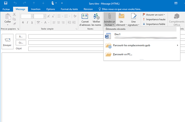 Envie de retrouver facilement un document pour le joindre dans un mail ? Avec Outlook 2016, les derniers documents utilisés s’affichent au moment de choisir votre pièce jointe. Il offre aussi la possibilité d’envoyer des fichiers du Cloud (OneDrive).