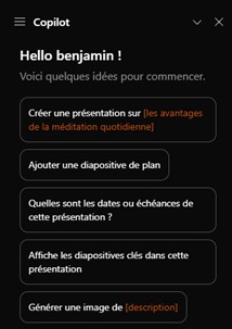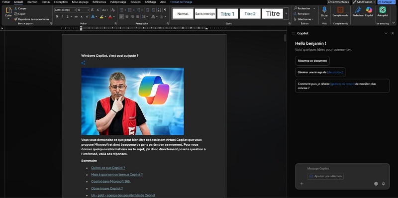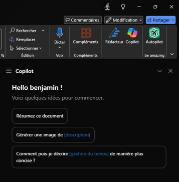 À droite de la capture d'écran, il y a une barre latérale intitulée *Copilot*, avec un message de bienvenue *"Hello benjamin !"* et des suggestions d'actions comme résumer le document, générer une description d'image, ou expliquer la gestion du temps de manière plus concise.