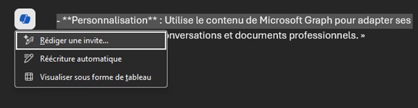 **Personnalisation** : Utilise le contenu de Microsoft Graph pour adapter ses réponses aux e-mails, conversations et documents professionnels. "