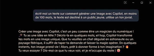 **Génération et amélioration de texte** ✍️ : Que ce soit pour rédiger des e-mails, des articles, des résumés ou même des poèmes, Copilot peut créer du contenu de haute qualité et vous aider à l’améliorer.