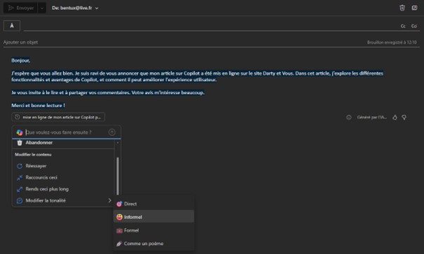 Pour la rédaction de mail les possibilités sont à mon gout assez impressionnantes. Comme pour rédiger un texte il suffit d’indiquer le sujet et le contexte, et par la suite de modifier les différents paramètres de longueur et style.