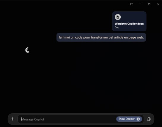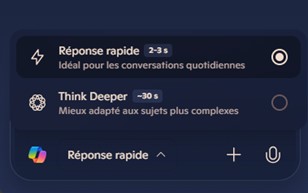 Vous avez le choix pour le type de réponses, rapides ou approfondies, il suffit de choisir l’option dans la barre de recherche Copilot. Que ce soit dans Edge ou directement dans l’application. Le choix de l’option " Think Deeper " allonge le temps de réponse mais on obtient un bien meilleur résultat sur les sujet complexes.