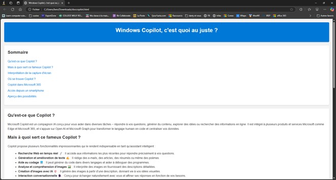 " D'accord ! Voici un exemple d'analyse d'image basée sur celle que vous avez envoyée. L'image montre une capture d'écran d'un document Microsoft Word intitulé *"Windows Copilot, c'est quoi au juste ?"*. Elle comprend une photo d'une personne portant une veste rouge et noire, avec un logo coloré en arrière-plan qui ressemble à celui de Windows Copilot. Sous l'image, il y a un paragraphe en français qui explique l'objectif du document : fournir des informations sur l'assistant virtuel Copilot.