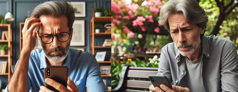 Voici le prompt qui a permis à Copilot de générer les images suivantes : "création d’une photo représentant un homme d’une cinquantaine d’années qui regarde ou smartphone d’un air dubitatif ".