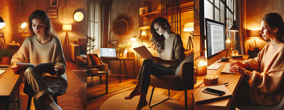 Un autre prompt : " crée-moi une photo d'une femme devant un ordinateur, dans une pièce de style cosy, en train de lire un article "