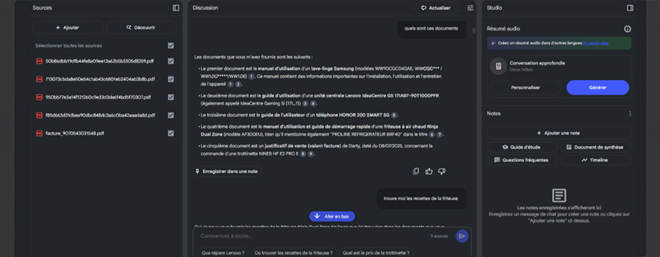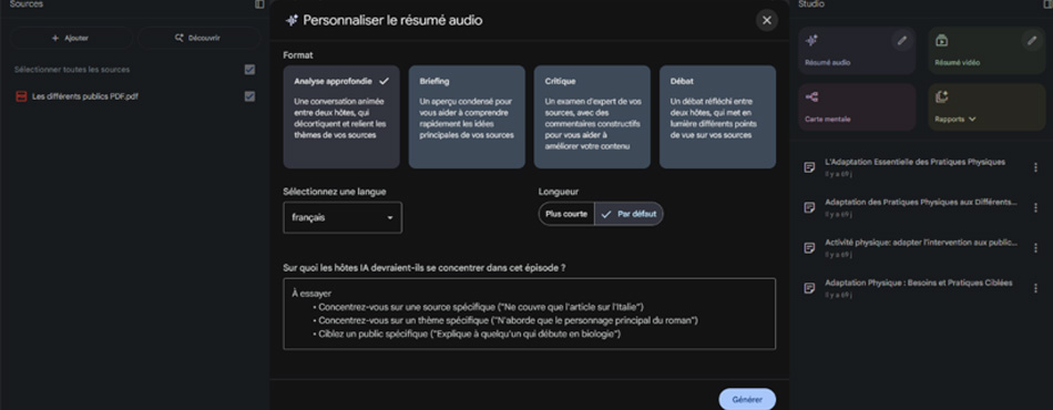 Envie d'écouter un résumé de vos documents pendant votre jogging ou votre pause-café ? NotebookLM peut générer un mini-podcast audio grâce à l'IA. Pour l'activer, il suffit de cliquer sur le bouton "Générer" dans la colonne de droite.
