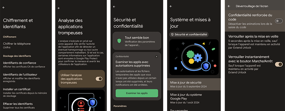 C’est le B.A.-BA. Activez l’écran de verrouillage de votre mobile, Il constitue une première barrière à l’accès de vos données et applis. Il y a plusieurs méthodes pour cela : schémas, code à chiffres, mot de de passe (chiffres et lettres) et les options biométriques capteur d’empreinte, reconnaissance faciale.