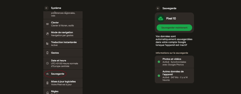Allez dans Paramètres > Système > Sauvegarde et tapez sur "Sauvegarder maintenant". Cela sécurise la liste de vos applications, vos contacts et vos SMS sur les serveurs de Google.