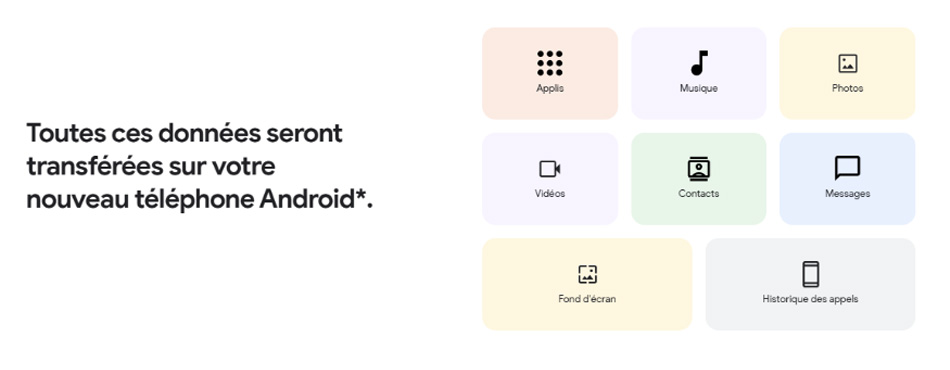 Lors de la configuration initiale, Google recommande d'utiliser un câble Lightning vers USB-C ou USB-C vers USB-C. Cela permet de récupérer plus efficacement photos, vidéos, contacts et messages. Le plus simple reste de tout synchroniser AVANT de changer d'appareil avec son compte Google (Google Contacts, Google Agenda, Google Photos).