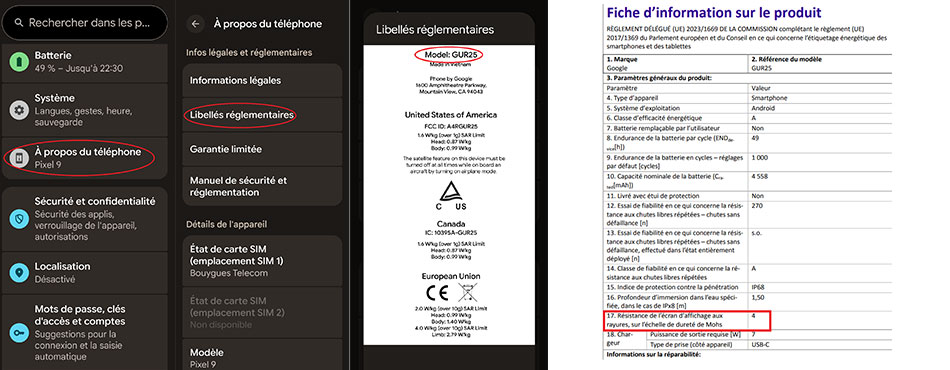 *Classement par numéro de modèle technique, que l’on retrouve dans : "Paramètres" => "À propos du téléphone" => "Informations sur l’appareil" => "Libellés réglementaires" pour les produits Android, et dans "Réglages" => "Général" > "Informations" pour les iPhone.)