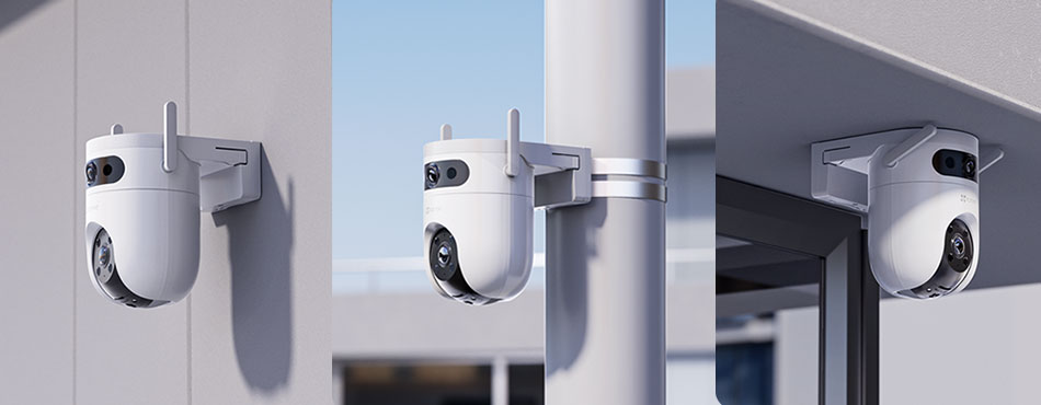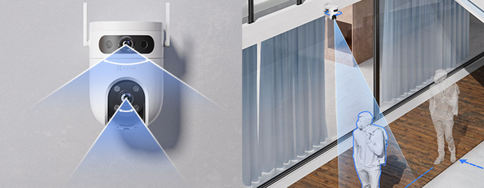La H9c est une caméra conçue spécifiquement pour l’extérieur. Elle combine un objectif grand angle fixe pour une surveillance continue et un second objectif orientable à 360° pour un suivi plus précis.