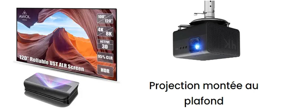 Le Awoil Vision (à gauche sur l'image ci-dessous) restera fixe devant l’écran et le BenQ Led 4K (à droite) sera disposé sur un support plafonnier ou sur un meuble.