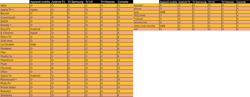 Certaines plateformes de streaming et de SVOD sont accessibles via tous les canaux : appareil mobile, TV et console. D'autres sont réservées à certains supports. Vérifiez la compatibilité des services de streaming sur le tableau ci-dessous !