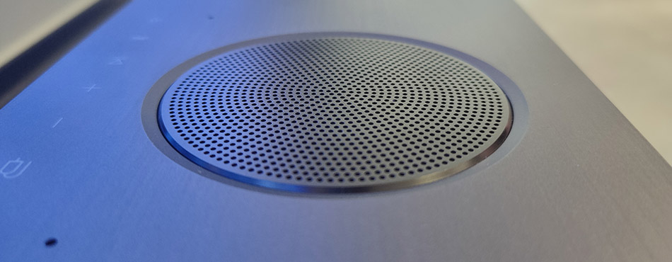 LG a profité du pied pour y incorporer 2 haut-parleurs de 10 Watts et 2 woofers de 10 Watts pour un total de 40 W ; impressionnant pour un appareil de ce gabarit ! Le son est ample et spatial, et la présence des haut-parleurs face à vous donne un volume étonnant. Il est équipé d’une prise casque pour les jeux en ligne (ou pour brancher un casque TV sans fil) mais aussi d’un micro intégré avec réduction de bruit pour une immersion exceptionnelle. La qualité audio est étonnante pour un produit de cette taille et le micro incorporé est une très bonne idée.
