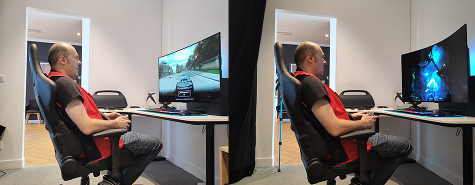 Mais ce qui le rend exceptionnel, c’est sa modularité. En effet, l’écran est flexible à la demande sur 20 niveaux. Il peut s’incurver de 0 à 900R de courbure sur une simple pression sur la télécommande. Et vous pouvez mettre 3 réglages en favoris. Cela permet de vous immerger dans votre jeu comme bon vous semble.