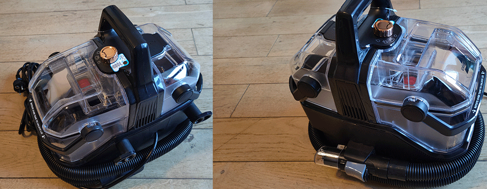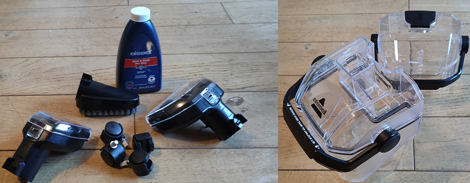 Relativement compact, avec ses dimensions de 32 x 39 x 36 cm, et affichant un poids de 5,9 Kg, il est fourni avec des roulettes à installer (c’est très simple), lesquelles facilitent grandement son déplacement d’une pièce à l’autre. Outre lesdites roues, on trouve également dans la boite deux outils de brossage de tailles différentes (7 et 12 cm, pour traiter des taches différentes en termes de textures et de dimensions), un outil multi-surface - qui permettra, comme son nom l’indique, d’alterner les différents types de surfaces - et enfin un échantillon du produit de nettoyage Spot & Stain Pro Oxy.