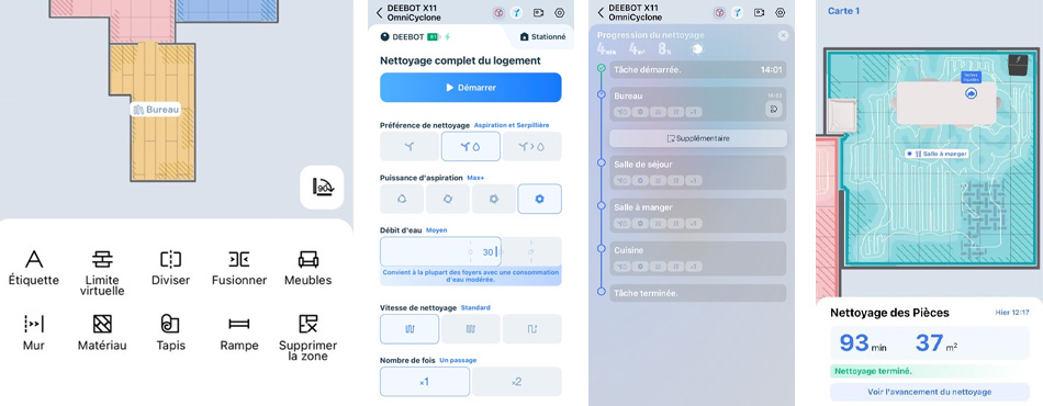 Une fois la carte de mon intérieur complétée, j’ai pu lancer un premier nettoyage. Là encore, toutes les options de nettoyage et de puissance sont ajustables au besoin :