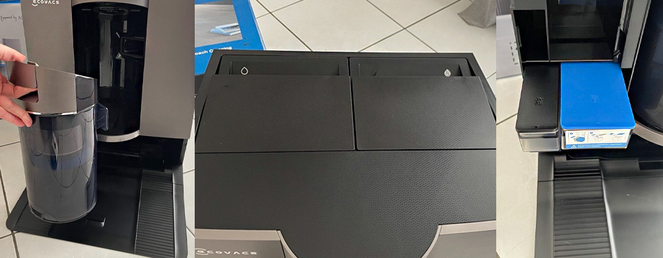 La première étape est d’installer la base dans un endroit où le robot aura la place de manœuvrer pour s’y brancher. Il faut qu’il y ait environ 0.5 m à gauche, à droite et à l’avant de la base. La station en elle-même est par ailleurs assez imposante, il faudra donc prévoir l’aménagement d’un espace suffisamment grand pour l’accueillir. Ensuite, on installe la rampe et on s’occupe des réservoirs. La station en possède 5 au total, mais seuls 3 sont à remplir. On retrouve :