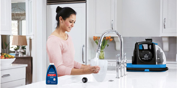 Une fois votre SpotClean C3 Essential en main, il vous suffit de le brancher et de le remplir d’un mélange d’eau et de détergent fourni avec l'appareil pour pouvoir commencer à l’utiliser. Pratique, toutes les quantités sont indiquées sur le réservoir dédié.