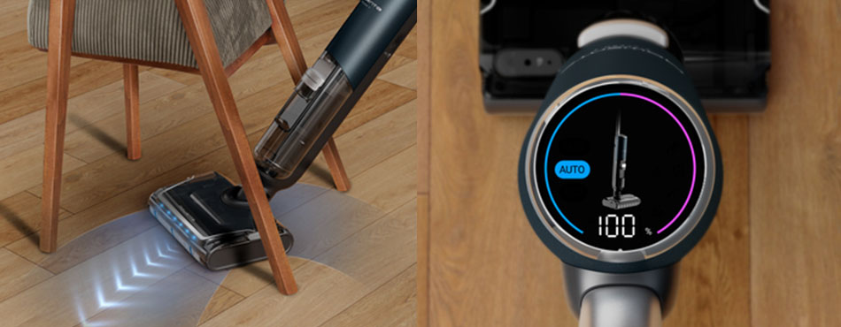 Le cœur du système est sa capacité à aspirer et laver en un seul passage. Il est doté d'un mode AUTO qui détecte automatiquement le type et le niveau de saleté pour ajuster la puissance d'aspiration et le débit d'eau.