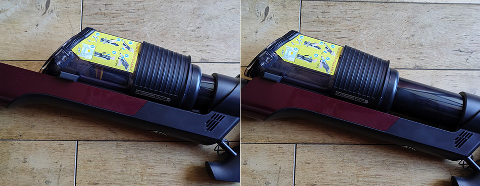 Mais ce qui fait la vraie différence du Hoover HF2 Ultra Compact X3, c’est son réservoir à poussière. Il dispose d’un ingénieux système qui permet, en l’utilisant un peu à la manière de certains pistolets Nerf ou d'un fusil à pompe, de comprimer la poussière pour gagner en espace. On profite ainsi non seulement d’une plus grande capacité restante du réservoir à poussière, mais aussi d’une meilleure aspiration.