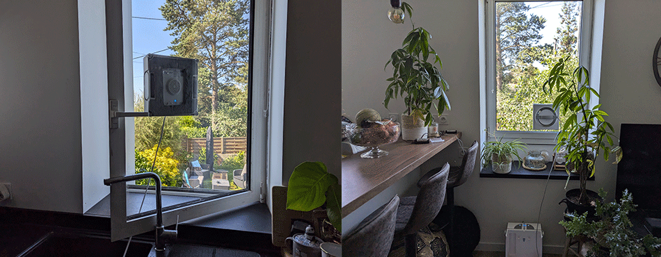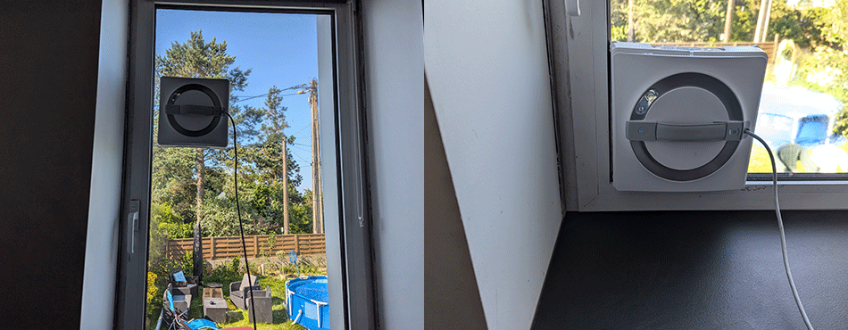 Pour le nettoyage des vitres extérieures, plus besoin de sortir l’échelle pour nettoyer mes vitres. Il suffit d’entrouvrir la fenêtre, et d'activer cette fois le mode nettoyage profond (durée de 5,44 minutes pour ma vitre). J’ai relancé un nettoyage une deuxième fois, car mes vitres n’avaient pas été nettoyées depuis un bon moment.