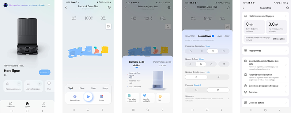 Une fois que tout est prêt, vous pouvez gérer le robot laveur à distance grâce à l'application "Roborock". Sur cette dernière, on peut voir plusieurs fonctionnalités différentes. Tout d'abord, vous avez la possibilité de sélectionner le mode de ménage que vous souhaitez faire : aspirer, laver ou aspirer et laver simultanément. Vous pouvez également régler la puissance de l'aspiration et le pourcentage d'humidité des serpillères.