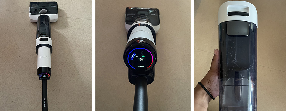 De plus, l'aspirateur nous guide du début à la fin, il nous dit quand procéder au vidage et remplissage du réservoir, et à l'auto-nettoyage, donc il est impossible d'oublier d'entretenir ce petit bijou. Par ailleurs, le réservoir de saletés et d'eau sale n'est pas opaque à 100%, ce qui nous permet de voir facilement ce que l'on aspire, la quantité et la couleur de l'eau sale.