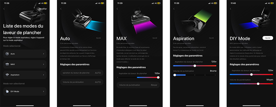 En dehors de créer un mode personnalisé, vous pouvez avoir accès aux réglages des modes pré-définis, notamment les modes MAX et Aspiration. Vous aurez alors la main sur le volume de pulvérisation et la puissance d'aspiration.