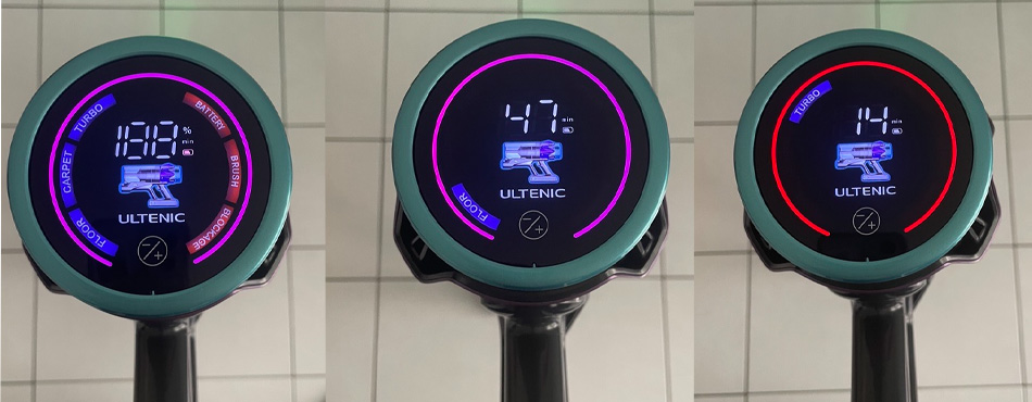 C’est l’heure du test ! Pour activer l’aspirateur, rien de plus simple : il suffit d’appuyer une fois sur le bouton. Sur l’UF18 Pro, il n’est en effet pas nécessaire de garder le doigt appuyé sur la détente pendant toute la durée de l’aspiration, un plus qui permet d’améliorer l’ergonomie globale. Ensuite, tout se fait sur l’écran LED tactile et coloré : il faut presser la touche « +/- » pour choisir le mode qui vous convient le mieux. Au choix, vous avez :
