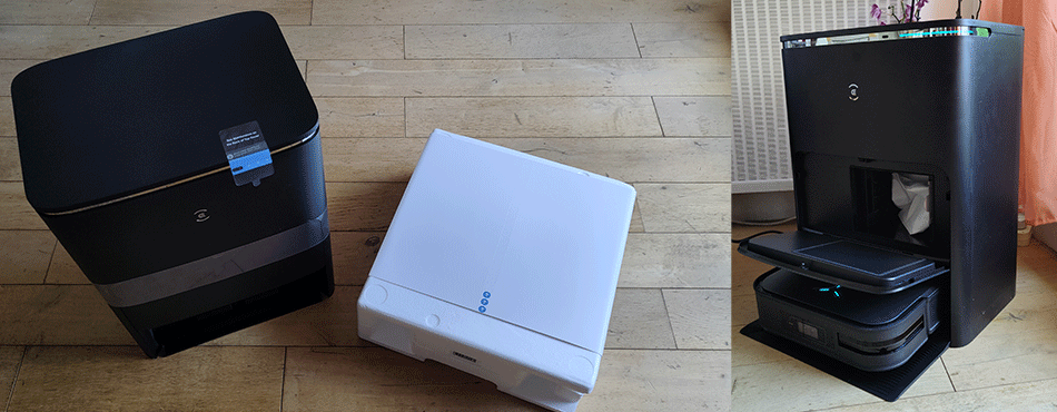 J’avoue avoir été surpris par le gabarit du carton à la réception du nouvel aspirateur robot laveur d’Ecovacs. Avec ses + de 15 kg, il vaut mieux prévoir un peu d’aide pour le déplacer si vous êtes seul(e) ! On trouve à l’intérieur de la boite l’aspirateur robot, une brosse latérale, une notice d’utilisation et la station de vidage.